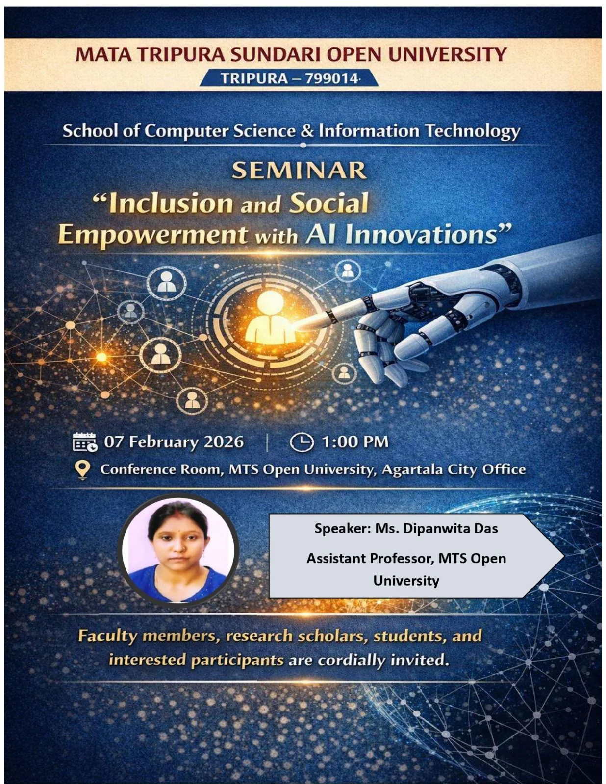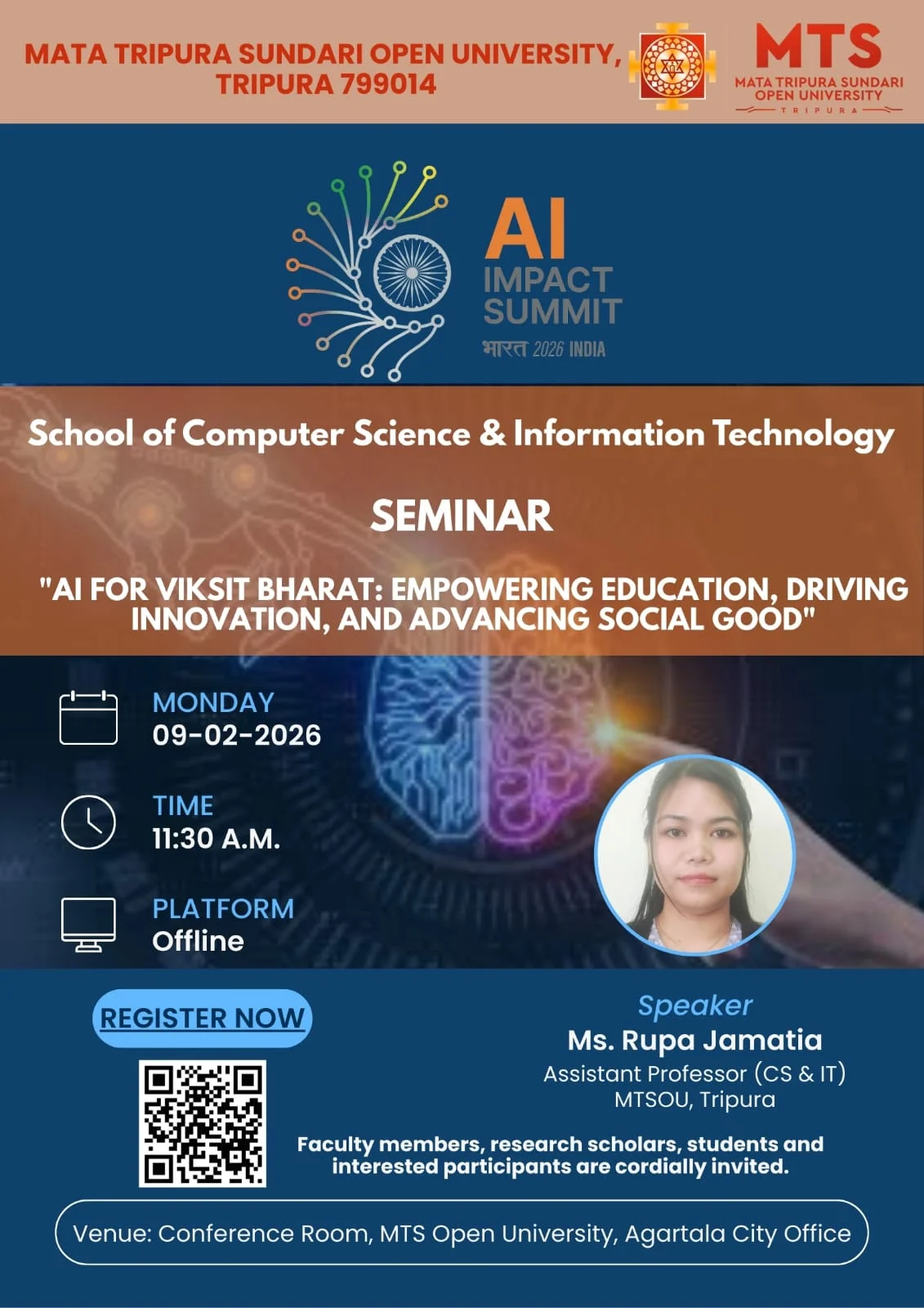 A seminar titled "AI for Viksit Bharat: Empowering Education, Driving Innovation, and Advancing Social Good" was successfully organized by the School of Computer Science & Information Technology, Mata Tripura Sundari Open University (MTSOU), Tripura. The seminar was held on Monday, 9th February 2026 at 11:30 A.M. in offline mode at the Conference Room, MTS Open University, Agartala City Office.
